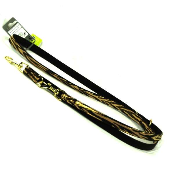 Trendige Führleine im coolen Zebra-look. Kunstleder im zebra look (golden). Karabiner und Ringe sind goldfarben. Sehr weiches, robustes Kunstleder.