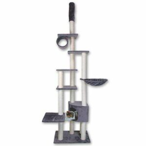Die Platten und die Höhle sind mit Plüsch bezogen und bieten so bequeme Schlafplätze, während die Sisal-Kratzstämme für eine gute Möglichkeit zum Krallenschärfen sorgen. Durch den Deckenspanner kann der Kratzbaum Cometa in Räumen mit 233 bis 263 cm Deckenhöhe aufgestellt werden.