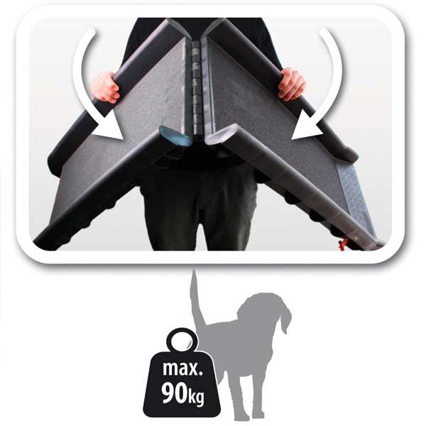 Die Rampe besteht aus Kunststoff und ist mit einer rutschsicheren Lauffläche ausgestattet. Das leichte Eigengewicht und die Möglichkeit des platzsparenden Zusammenklappens machen die Gentle Step zum idealen täglichen Begleiter. Die Hunderampe kann bis max. 90 kg belastet werden.