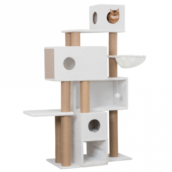 Der als Raumteiler nutzbare Kratzbaum Catarina bietet gleich mehreren Stubentigern genügend Platz zum Ausruhen, Klettern und Spielen. In den mit weichem Plüsch und Fleece bezogenen Höhlen auf unterschiedlichen Ebenen können sich deine Katzen ausruhen, verstecken und durch gleich mehrere Öffnungen Ausschau halten. Die Höhlen sind mit Wendekissen ausgestattet, welche per Handwäsche gereinigt werden können. Auch der stabile Kuschelsack ist bestens zum Ausruhen geeignet. Die mit Jute ausgestatteten Kratzstämme und die zwei Sisalkratzflächen an den Außenseiten bieten deinen Samtpfoten diverse Kratz- und Klettermöglichkeiten, zur zusätzlichen Beschäftigung ist ein Spielball aus Plüsch am Kratzbaum befestigt.